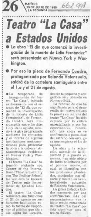 Teatro "La casa" a Estados Unidos. [artículo] La Segunda (Santiago, Chile)-- jul. 29, 1980, p. 26. .