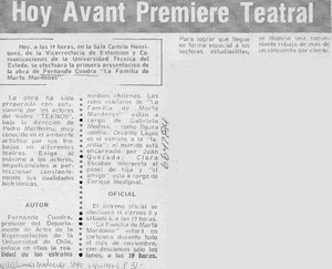 Hoy avant premiere teatral. [artículo] Las Últimas Noticias (Diario : Santiago, Chile)-- nov. 1, 1976, p. 31. .