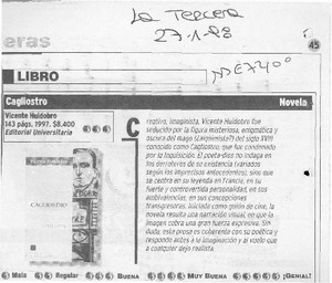 Cagliostro [artículo]. La Hora. -- ene. 27, 1998, p. 33 La Tercera. -- ene. 27, 1998, p. 45 il. .