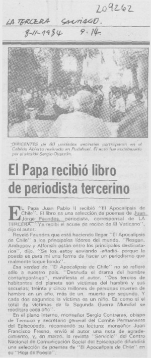 El Papa recibió libro de periodista tercerino [artículo]. La Tercera. -- feb. 8, 1984, p. 14 .