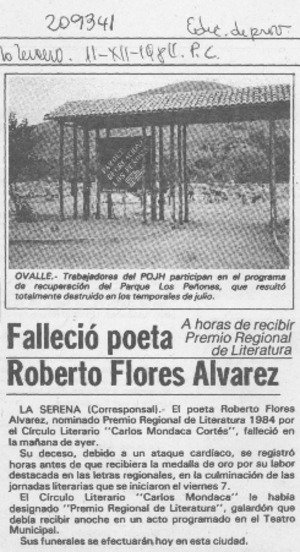 Falleció poeta Roberto Flores Alvarez [artículo]. La Tercera. -- Ed. de provincia. -- dic. 11, 1984, p. C. .