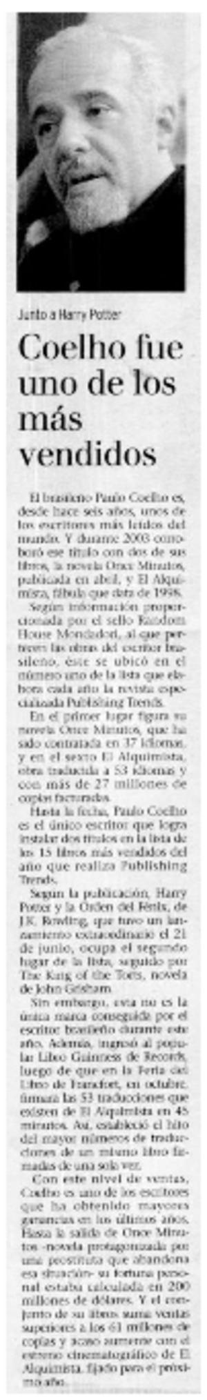 Coelho fue uno de los más vendidos. [artículo] La Tercera de La Hora (Diario : Santiago, Chile)-- dic. 27, 2003, p. 40. retr. .