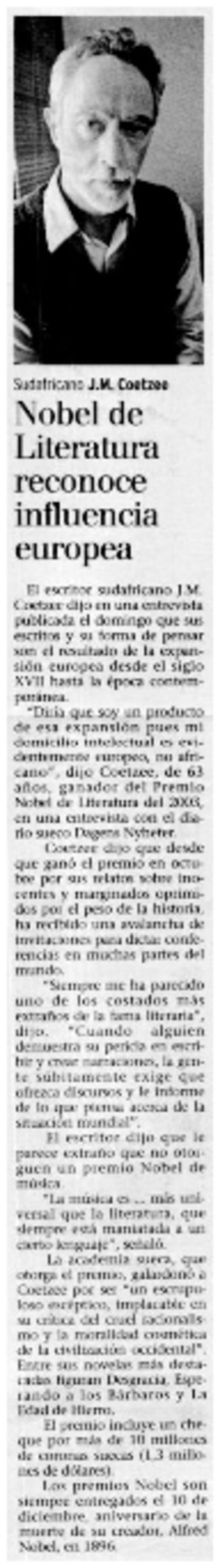 Nobel de Literatura reconoce influencia europea. [artículo] La Tercera de La Hora (Diario : Santiago, Chile)-- dic. 8, 2003, p. 36. retr. .