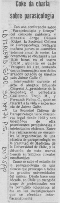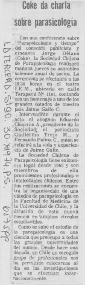 Coke da charla sobre parasicología. [artículo] La Tercera (Diario : Santiago, Chile)-- oct. 30, 1974, p. 5. .