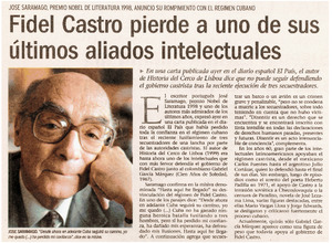 Sobre el título: José Saramago, Premio Nobel de Literatura 1998, anunció su rompimiento con el régimen cubano.