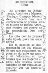 Museo de oro. [artículo] La Tercera (Diario : Santiago, Chile)-- ago. 28, 1978, p. 11. .