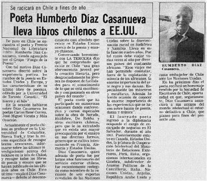 Poeta Humberto Díaz Casanueva lleva libros chilenos a EE.UU. [artículo] La Tercera (Diario : Santiago, Chile)-- mar. 19, 1981, p. 9. retr. .