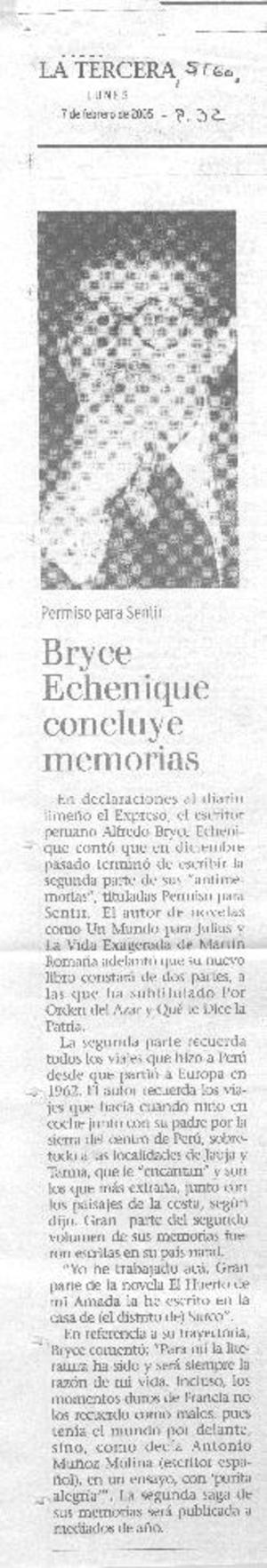 Bryce Echenique concluye memorias. [artículo] La Tercera (Diario: Santiago, Chile)-- feb. 7, 2005, p. 32 retr. .