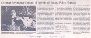 Carmen Berenguer obtiene el Premio de Poesía Pablo Neruda [artículo]. La Tercera (Diario: Santiago, Chile) mar. 15, 2008, p. 99 .