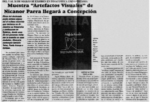 Muestra "Artefactos visuales" de Nicanor Parra llegará a Concepción. [artículo] La Tribuna (Diario : Los Angeles, Chile)-- feb. 28, 2002, p. 9. .