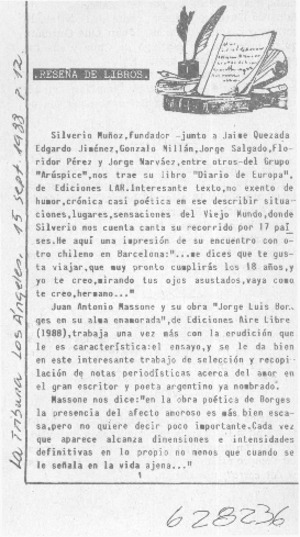 Jorge Luis Borges en su alma enamorada [artículo] La Tribuna (Los Ángeles) sept. 15, 1988, p. 12 .