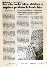 Doce universidades chilenas oficializan su respaldo a postulación de Gonzalo Rojas [artículo] La Tribuna (Los Angeles, Chile) ene. 21, 2006, p. 22. .