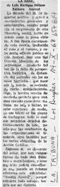 La base, de Luis Enrique Délano. [artículo] La Tribuna (Los Angeles, Chile)-- oct. 14, 1968. .