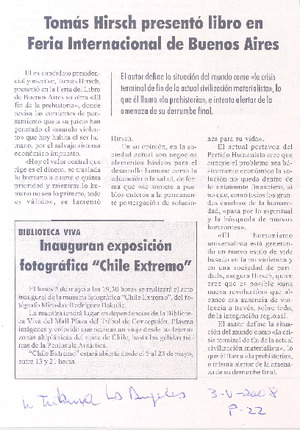 Tomás Hirsch presentó libro en Feria Internacional de Buenos Aires [artículo]. La Tribuna (Los Angeles, Chile) mayo 3, 2008, p. 22 .