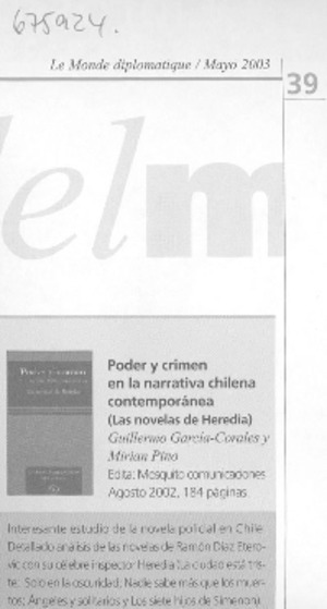 Poder y crimen en la narrativa chilena contemporanea. [artículo] Le Monde Diplomatique (Santiago, Chile)-- mayo 2003, p. 39. il. .