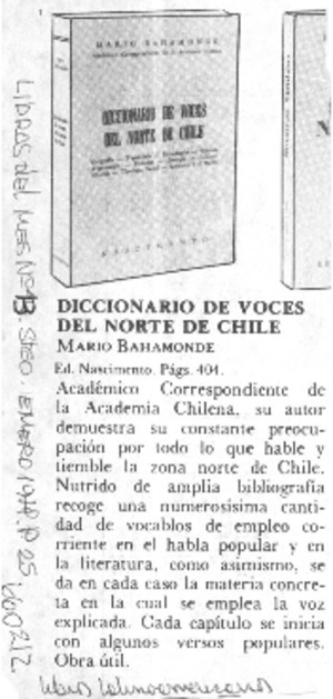 Diccionario de voces del norte de Chile. [artículo] Libros del mes (Santiago, Chile)-- no. 13 (ene. 1979) p. 25. il. .
