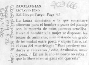 Zoologías. [artículo] Libros del Mes (Santiago, Chile)-- No. 16 (mayo 1979) p. 22. .
