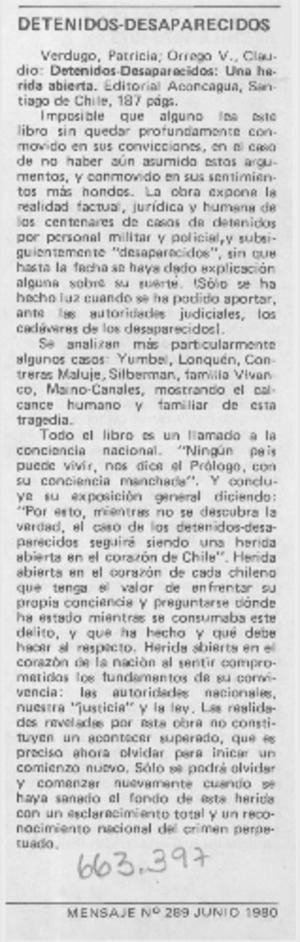 Detenidos-Desparecidos. [artículo] Mensaje (Santiago, Chile)-- no. 289 (jun. 1980) p. 294. .
