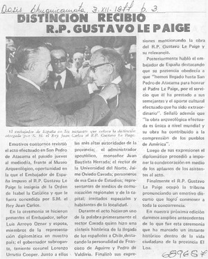 Distinción recibió R. P. Gustavo Le Paige. [artículo] Oasis (Chuquicamata, Chile)-- dic. 3, 1977, p. 3. retr. .