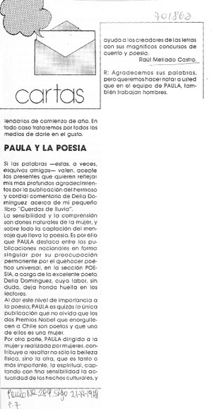Paula y la poesía. [artículo] Paula (Santiago, Chile)-- no. 289 (nov. 21, 1978) p. 7. .