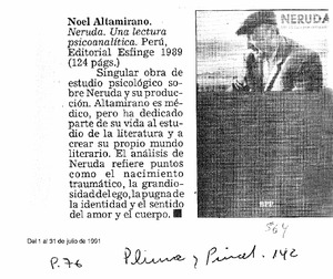 Neruda, una lectura psicoanalítica. [artículo] Pluma y Pincel no. 142 (jul. 1, 1991) p. 76. il. .