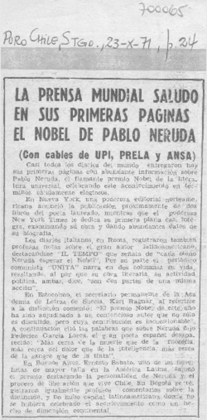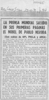 La Prensa mundial saludó en sus primeras páginas el Nobel de Pablo Neruda. [artículo] Puro Chile (Santiago, Chile)-- oct. 23, 1971, p. 24. .