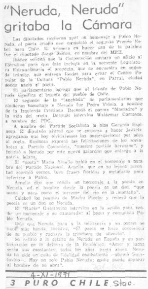 "Neruda, Neruda" gritaba la Cámara. [artículo] Puro Chile (Santiago, Chile)-- nov. 4, 1971, p. 3. .