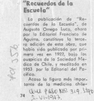Recuerdos de la escuela. [artículo] Qué Pasa (Revista : Chile)-- no. 319 (jun. 2, 1977) p. 74. .