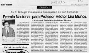 Premio Nacional para profesor Héctor Lira Muñoz [artículo] VI Región sept. 23, 1999, p. 12 retr. .