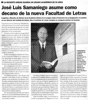José Luis Samaniego asume como decano de la nueva Facultad de Letras. [artículo] Visión Universitaria (Revista : Santiago, Chile)-- no. 117 (oct. 2003) p. 6. retr. .