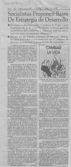 Socialistas proponen bases de estrategia de desarrollo [artículo]. El Mercurio (Santiago). -- jun. 29, 1988, p. C4 il. .