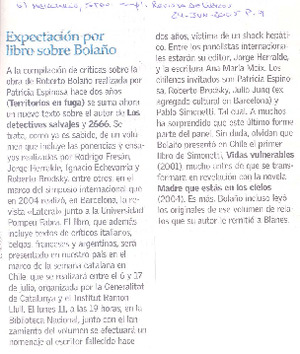 Expectación por libro sobre Bolaño [artículo] El Mercurio (diario : Santiago, Chile) Revista de libros, junio 2005, p. 9. .