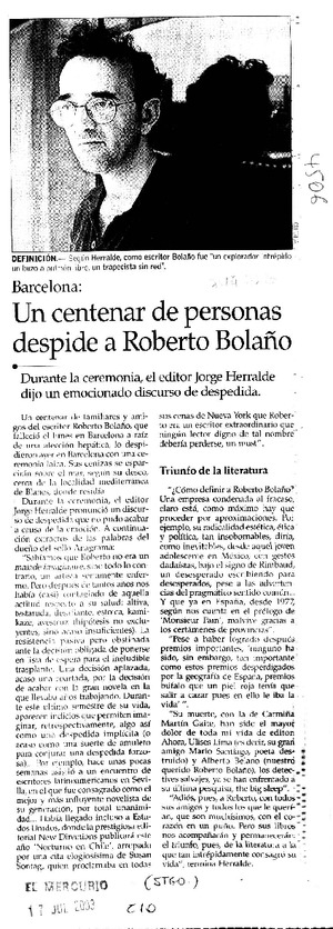 Un Centenar de personas despide a Roberto Bolaño. [artículo] El Mercurio (Diario : Santiago, Chile)-- jul. 17, 2003, p. C10. retr. .