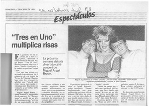 "Tres en uno" multiplica risas [artículo]. Las Últimas Noticias (Diario : Santiago, Chile)-- abr. 28, 1989, p. 8 (suplemento) .
