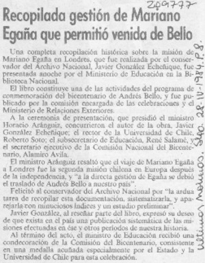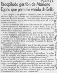 Recopilada gestión de Mariano Egaña que permitió venida de Bello [artículo]. Las Últimas Noticias (Diario : Santiago, Chile)-- abr. 28, 1984, p. 8. .