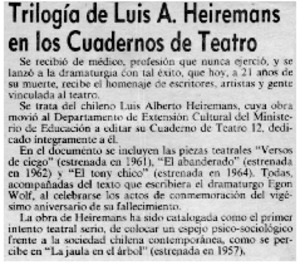 Trilogía e Luis A. Heiremans en los cuadernos de teatro. [artículo] Las Últimas Noticias (Diario : Santiago, Chile)-- nov. 3, 1985, p. 11. .