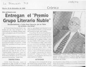 Entregan el "Premio Grupo Literario Ñuble" [artículo] La Discusión dic. 26, 2000, p. 5 retr. .