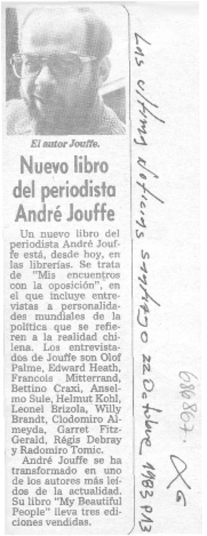 Nuevo libro del periodista André Jouffé. [artículo] Las Últimas Noticias (Diario : Santiago, Chile)-- oct. 22, 1983, p. 13. retr. .