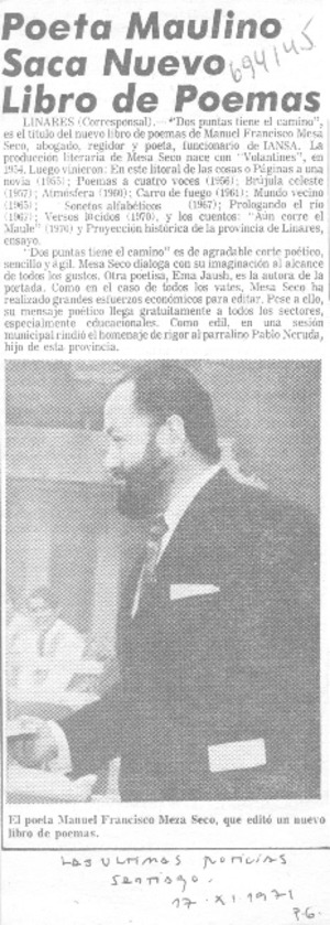 Poeta maulino saca nuevo libro de poemas. [artículo] Las Últimas Noticias (Diario : Santiago, Chile)-- oct. 17, 1971, p. 6. retr. .