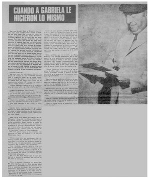 Cuando a Gabriela le hicieron lo mismo. [artículo] Puro Chile (Diario : Santiago, Chile)-- oct. 31, 1971, p. 10 (suplemento) retr. .