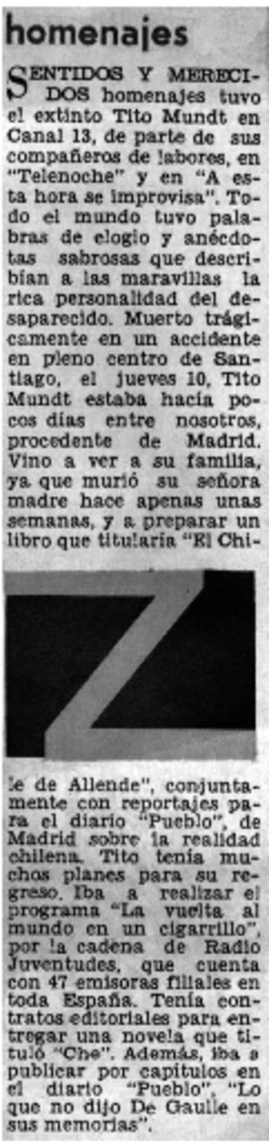Homenajes. [artículo] Telecran (Santiago, Chile)-- no. 93 (jun. 18, 1971) p. 8. .