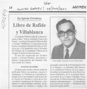 Libro de Rafide y Villablanca [artículo] Mundo Árabe (Santiago) feb. 28, 2002, p. 18 retr. .