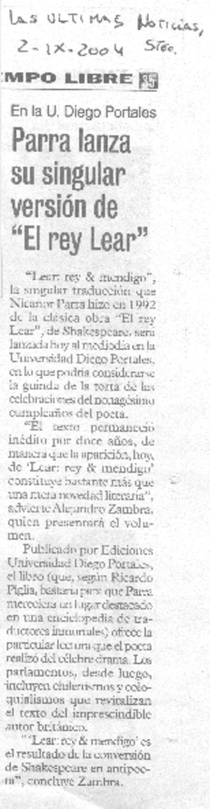 Parra lanza su singular versión de "El rey Lear". [artículo] Las Últimas Noticias (Diario : Santiago, Chile)-- sept. 2, 2004, p. 35 .