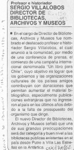 Sergio Villalobos, Director de Bibliotecas, Archivos y Museos [artículo]. Revista de Educación (revista : Santiago, Chile)-- no. 176 (mayo 1990) p. 9. .