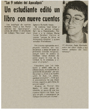 Un estudiante editó un libro con nueve cuentos. [artículo] El Mercurio (Antofagasta, Chile)-- ago. 8, 1985, p. 4. El Mercurio (Calama, Chile) retr. .