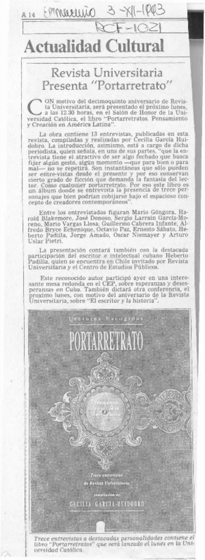 Revista Universitaria presenta "Portarretrato" [artículo]. El Mercurio (Santiago). -- dic. 3, 1993, p. A14 .