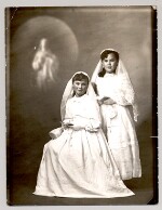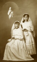 Una de las niñas está de pie y la otra sentada. Ambas con velos largos, guantes, bolsos, con el libro entre sus manos. Al fondo se ve la imagen de la vírgen.