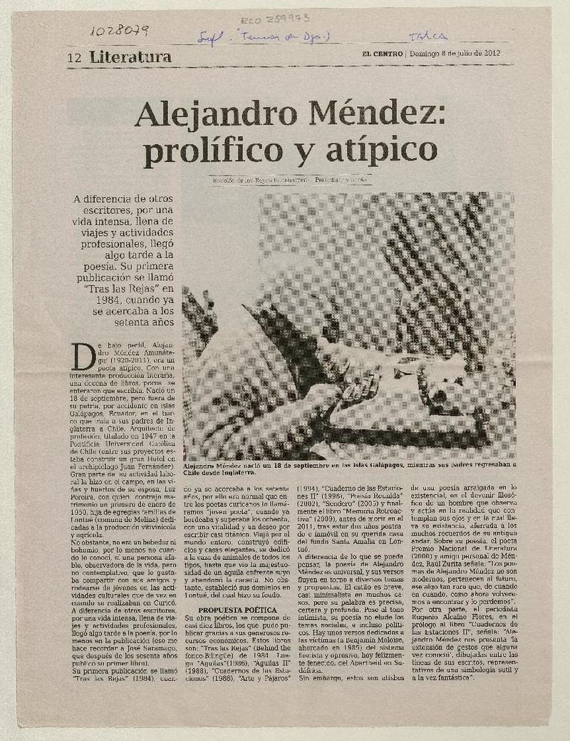 Alejandro Méndez: prolífico y atípico [artículo] / Rodolfo de los Reyes Recabarren. El Centro (Diario : Talca, Chile) -- jul. 8, 2012, p. 12-13 (suplemento "Temas de Domingo") .