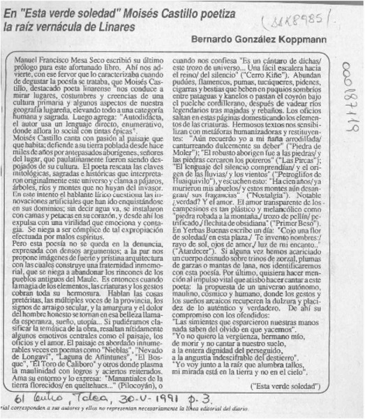 En "Esta verde soledad" Moisés Castillo poetiza la raíz vernácula de Linares [artículo] Bernardo González Koppmann.