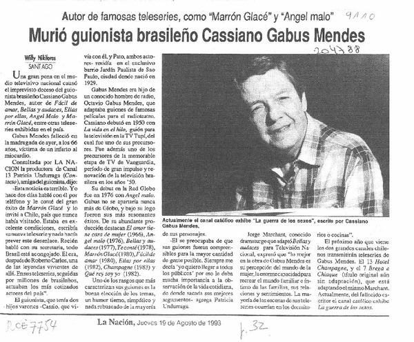 Murió guionista brasileño Cassiano Gabus Mendes  [artículo] Willy Nikiforos.